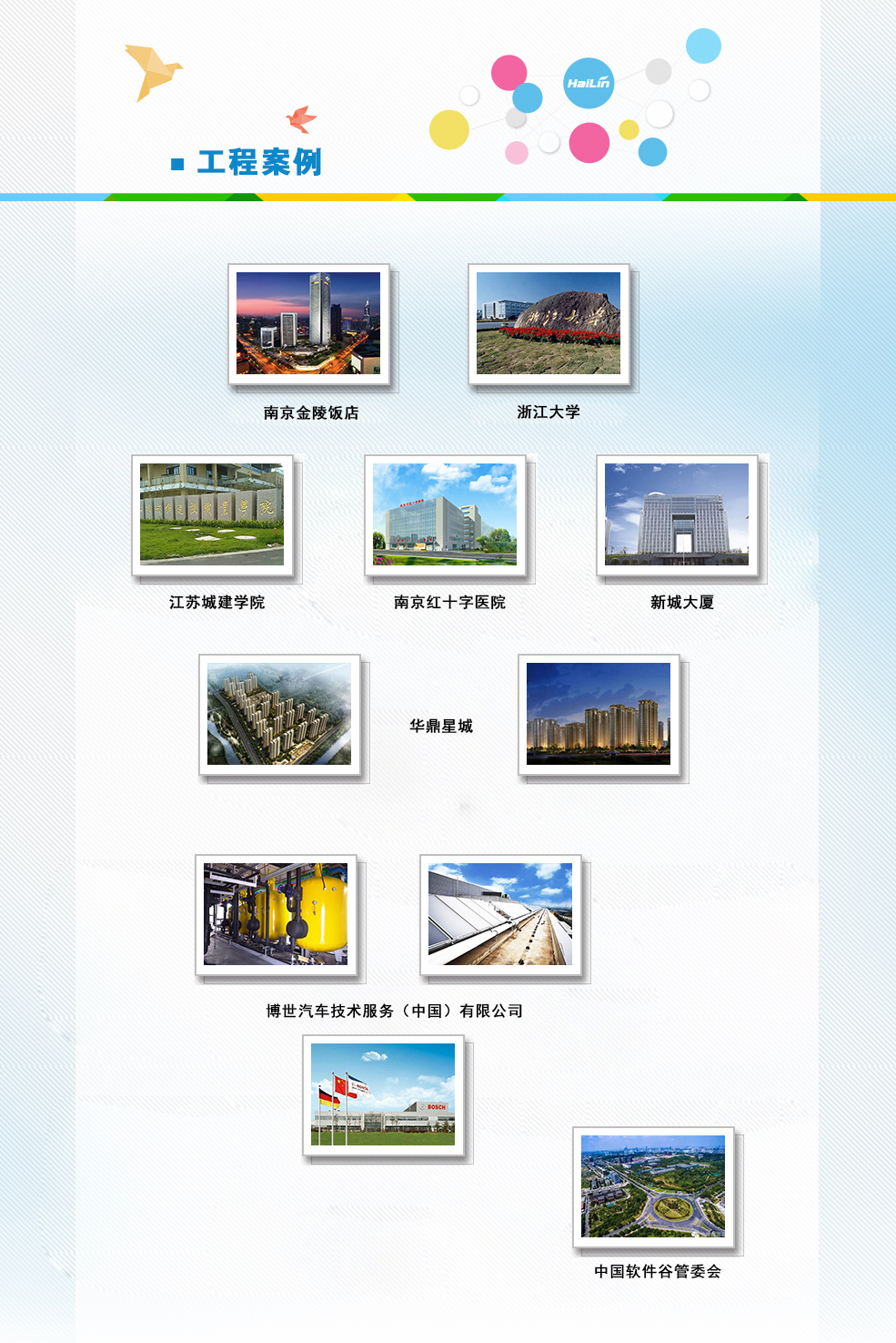 海林積極參與鳥巢、水立方、奧運村、APEC等國家重大項目、多項國家及省市的地標性建筑項目,以及機場、高鐵站、地鐵站、醫院、學校等重大項目;同時,海林與國內多家知名房地產商如萬科、綠地、金地、綠城等達成了戰略合作,將建筑室內舒適環境改善及節能解決方案的新思路、新技術、新產品廣泛應用于公共建筑和住宅中,實現了舒適及節能應用,為中國的節能環保事業及工作生活環境的改善發揮著巨大的作用。