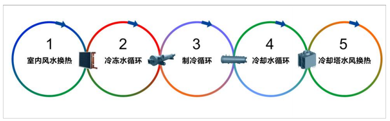 全面精細化實現高效制冷機房設計,歸納于對五大循環系統的深入研判后的能效提升,它們分別是:1)室內水風循環;2)冷水循環;3)制冷循環;4)冷卻水循環;5)冷卻塔水風換熱循環,如下圖所示。其中與冷卻水系統節能直接相關的循環有冷卻水循環和冷卻塔風水換熱循環。冷卻水循環涉及冷卻水供回水溫差;冷卻塔水風換熱循環涉及冷卻塔供水溫度和室外濕球溫度的溫差,是為兩個溫差。