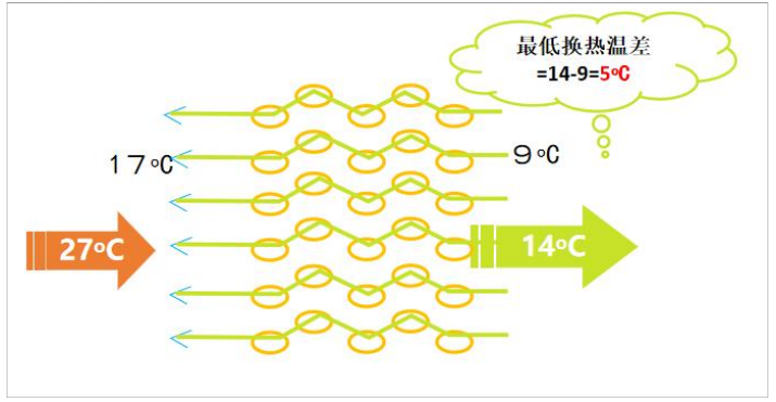 過去很長的一段時間內冷水系統大溫差的設計及其理論為暖通設計行業所耳熟能詳,相關論文闡述也很多,冷水大溫差多為降低冷水出水溫度,同時提高冷水回水溫度為代表(姑且叫第一類大溫差)如典型溫差為 7℃即 6-13℃循環溫度,末端采用吊裝空調箱的大型購物中心項目,如筆者親身經歷的合肥萬科廣場購物中心項目,見文獻[2]。這類大溫差的本質是:在主機供水溫度(出水溫度低于 7℃)和既定溫差(溫差大于 5℃)下選型同時選擇能效比高的冷水泵,在滿足計算制冷量和規范的主機制冷量前提下,主機能耗的增加的數值小于水泵能耗的下降的數值,使得冷水循環側的主機和水泵的綜合能效最小。近年來出現的冷水側大溫差即中溫冷水機組的大溫差(姑且叫第二類大溫差),即通過改進末端空調設備結構形式,只要空調機組出風干球溫度控制在≤14℃以下,系統可以提供不同的供回水溫度(供水溫度大于 7℃,回水溫度大于 12℃),冷水系統可以提供 9.5℃-14.5℃、8.8℃-14.8℃、8℃-15℃等不同的供回水溫度組合,如文獻三[3]中南京三山街大型購物中心高效制冷機房的大溫差供回水溫度為 10℃-16℃;文獻四[4]提到的五邑大學教學樓高效制冷機房的供回水溫度為 10℃-18℃,當然該項目較為特殊,是配合了改進的末端(需要采用全新的中溫末端設備,從換熱能力、出風溫度、風側壓降、水側壓降等四個維度進行全面優化)及輔助電風扇的采用,能達到所需要的溫濕度要求。因此第二個階段的冷水大溫差是提高供水溫度,同時提高供回水溫差的形式。下圖為中溫水大溫差的六排管逆流換熱圖。采用中溫變頻空調系統制冷機房某項目能效可達到 6.85。