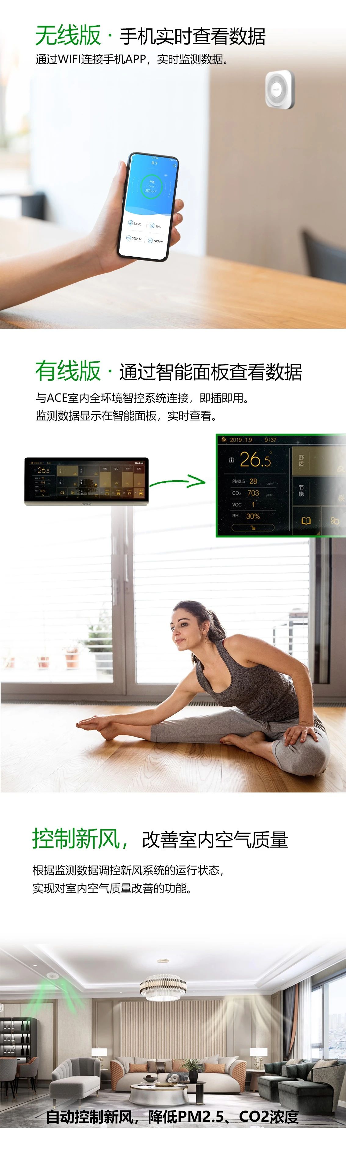 集 PM2.5、TVOC、CO? 、溫度、濕度的監測功能于一體,時精準監測,數據一目了然