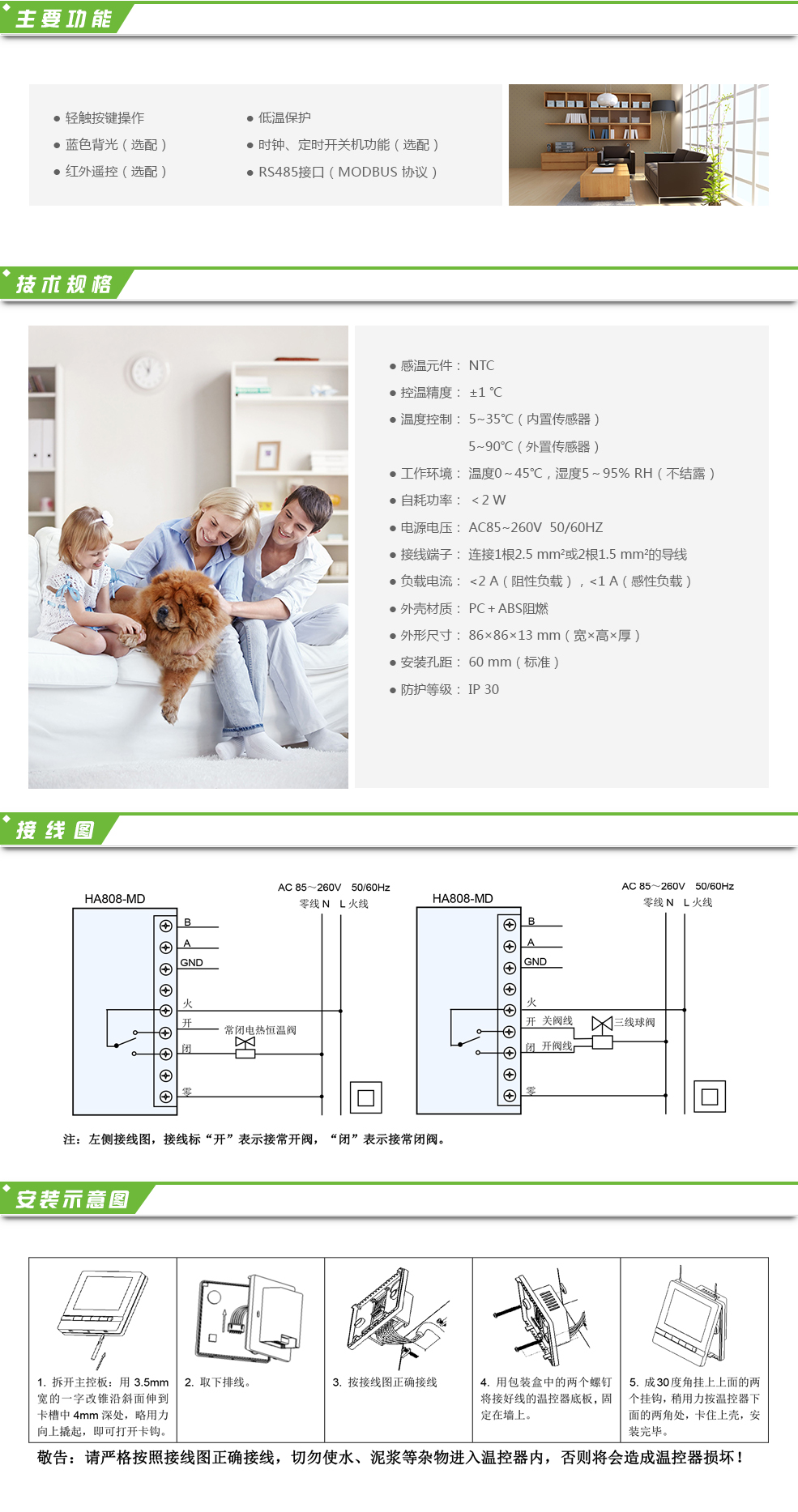 網絡型溫控器HA808-MD是適用于水采暖系統的采暖溫控器,用于家庭、辦公樓、寫字樓、學校等場所。通過控制電熱閥(或球閥)的開啟與關閉,達到調節室內溫度的作用,同時具備低溫保護功能。可通過網絡(MODBUS 協議)實現遠程數據采集和集中控制。