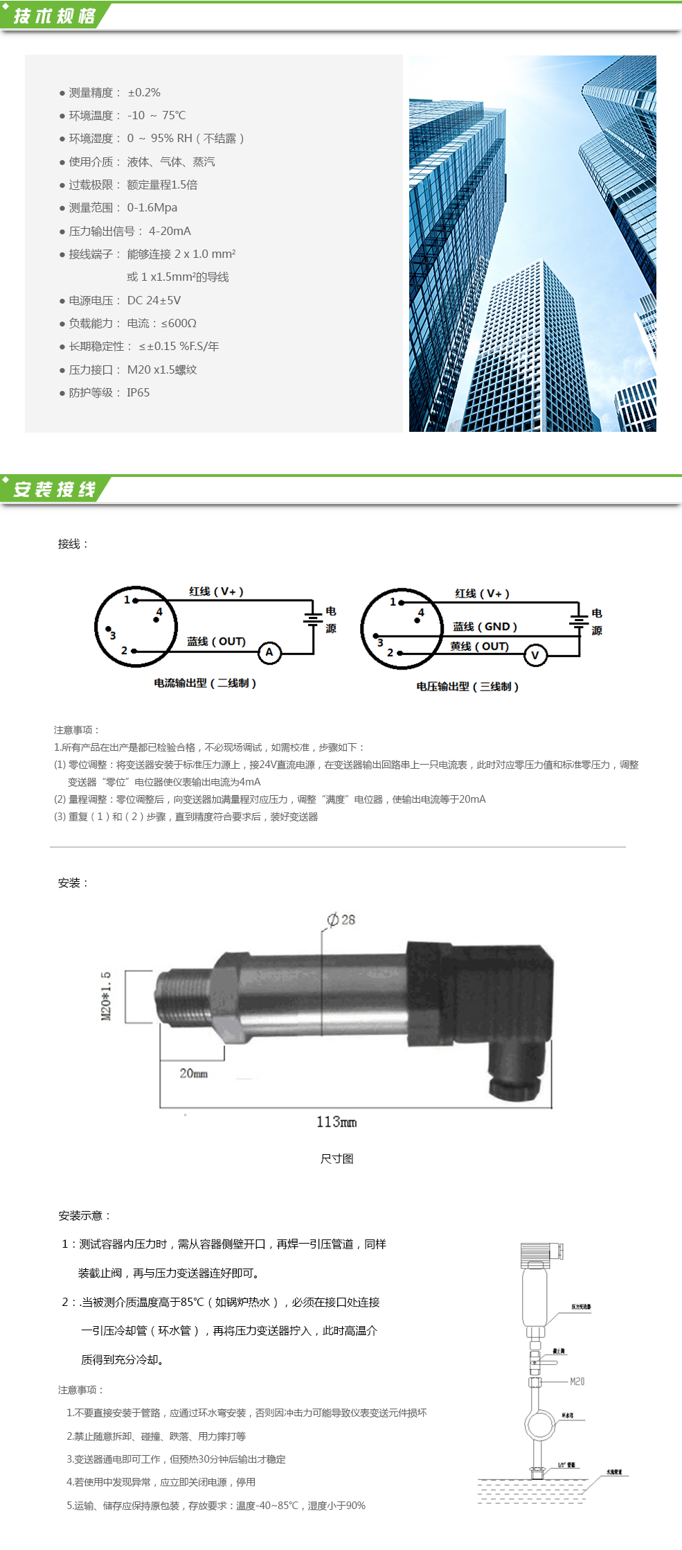 HL-PS16壓力變送器具有測量精度高,穩定性高,體積小等優點,廣泛應用于環境、醫藥、電力、食品、冶金等行業,作為管道壓力控制、液位控制。變送器輸出采用兩線4-20mA,傳感器與介質解除部分全部為不銹鋼,可直接安裝在測量管道上,使用方便。