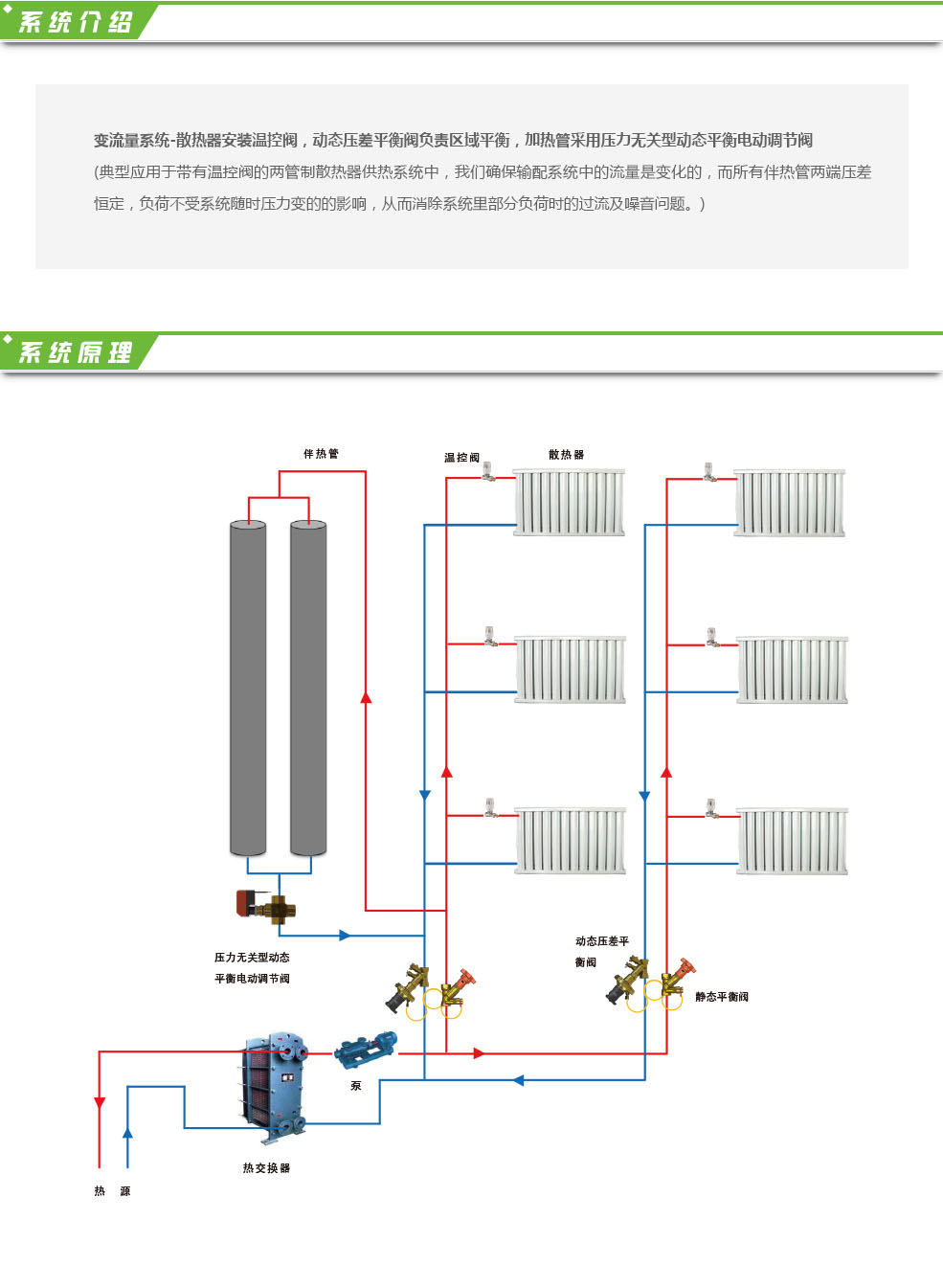 散熱器安裝溫控閥,動(dòng)態(tài)壓差平衡閥負(fù)責(zé)區(qū)域平衡,加熱管采用壓力無關(guān)型動(dòng)態(tài)平衡電動(dòng)調(diào)節(jié)閥